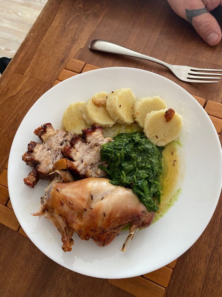 Výborné spojení králíka a bůčku s domácím knedlíkem a špenátem s jemnou chutí česneku. Tomuto pokrmu nemohu nic vytknout.