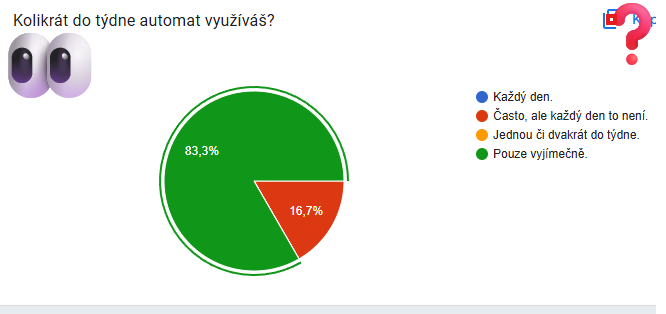 Z našeho průzkumu jsme se dozvěděli, že drtivá většina studentů využívajících automat jsou studenti vyššího gymnázia. To vyplývá pravděpodobně z věkové limitace na většině produktů v automatu nabízených. Automat je studenty využíván především výjimečně a nikdo z dotázaných v něm své peníze neutrácí každý den. Celkově jeho přítomnost je na škole studenty vnímána velice pozitivně.